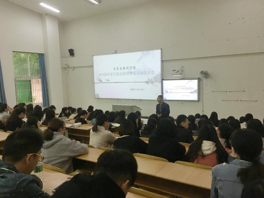 2017年11月8日,文学与新闻学院2018届毕业生就业指导暨实习动员大会于6116教室举行,大会分为9:00、14:30、19:00三个场次,分别由文学与新闻学院院长林健、学生工作副院长何杨波、教学工作副院长缪佳芹主持。三位院长从实习态度、实习政策、就业方向、简历设计、面试准备等方面分别对同学们进行现场指导。