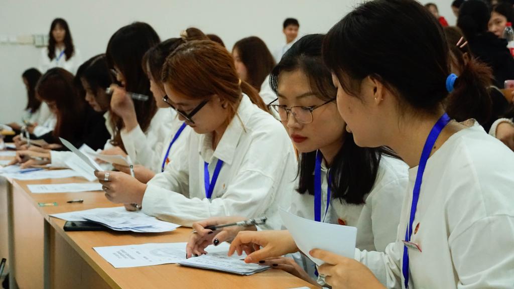 大会正式开始,待全体同学起立齐唱共青团团歌后,文创学院陈副院长上台致辞,她把参选的候选人比作即将绽放的蓓蕾,希望他们能够珍惜此次机会,鼓励他们尽情的展现自己的风采。致辞结束后,主持人上台宣布此次评选大会相的关规则,同学们鼓掌通过。随后,工作人员宣读此次大会7位候选人:田美玲、袁磊、任慧贤、谭丹宁、陈冲、章流韵、王皓的基本信息,信息虽短,五脏俱全,只言片语间,同学们已为候选人的优秀感叹不已,现场气氛变得严肃活泼。候选人迎着同学们热烈的掌声,迈着自信的步伐走向讲台,神采奕奕的向大家描述丰富多彩的大学生活,谦虚的展示自己的学习成果,从容冷静的应对在场教师与学生的提问,举手投足间,尽显志得意满。
