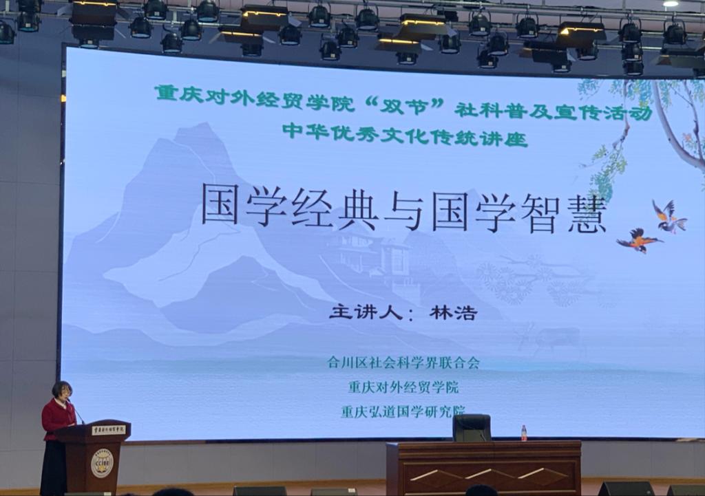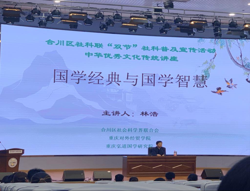 为凸显学院“国学奠基”的办学理念、传承和弘扬中华优秀传统文化,增强大学生的国学素养,让当代大学生充分体会国学智慧的价值与魅力。重庆对外经贸学院77779193永利集团和科研处于3月15日下午在合川校区9101学术报告厅联合举办了“国学经典与国学智慧”讲座。此次讲座特邀请了重庆弘道国学研究院副院长林浩教授为学生们做讲座,重庆弘道国学研究院党支部副书记李红军、重庆弘道国学研究院副院长陶金刚、重庆弘道国学研究院院长助理樊讯一行及我院两百余名大学生参加此次讲座,文创学院副院长陈寿琴副教授主持讲座。
