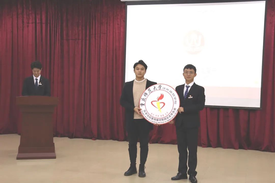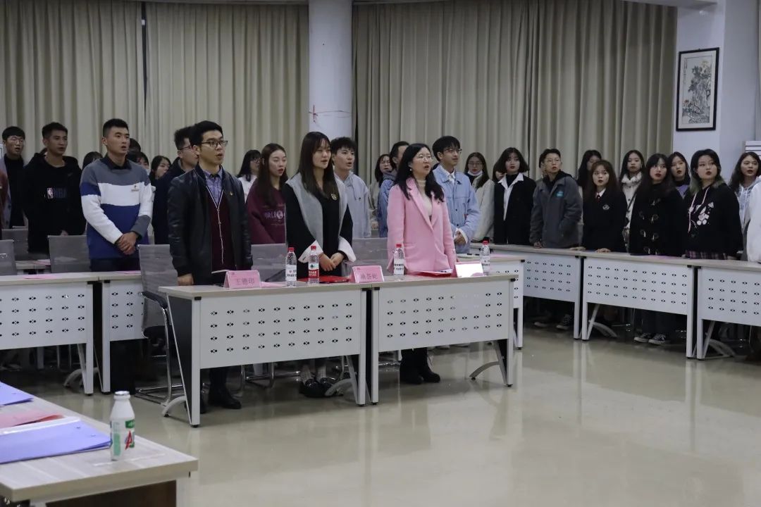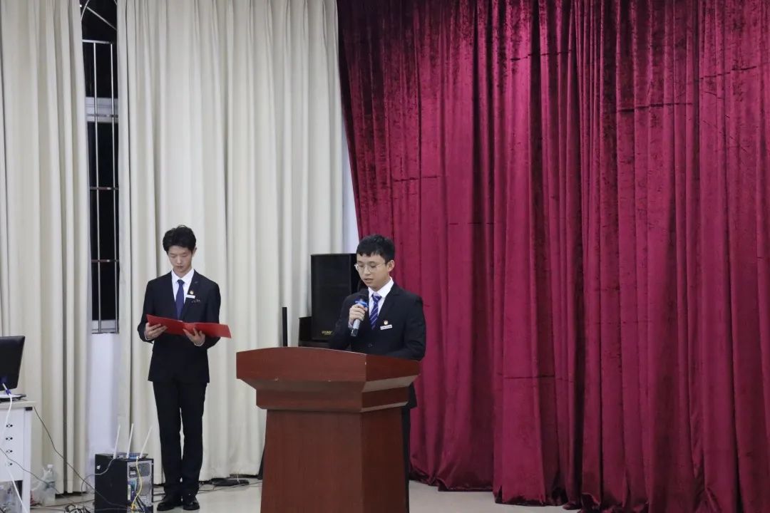 十七届学生组织工作人员向展平带领全体十七届学生组织成员进行宣誓,紧接着十六届学生组织工作人员与新一届工作人员进行交接仪式。