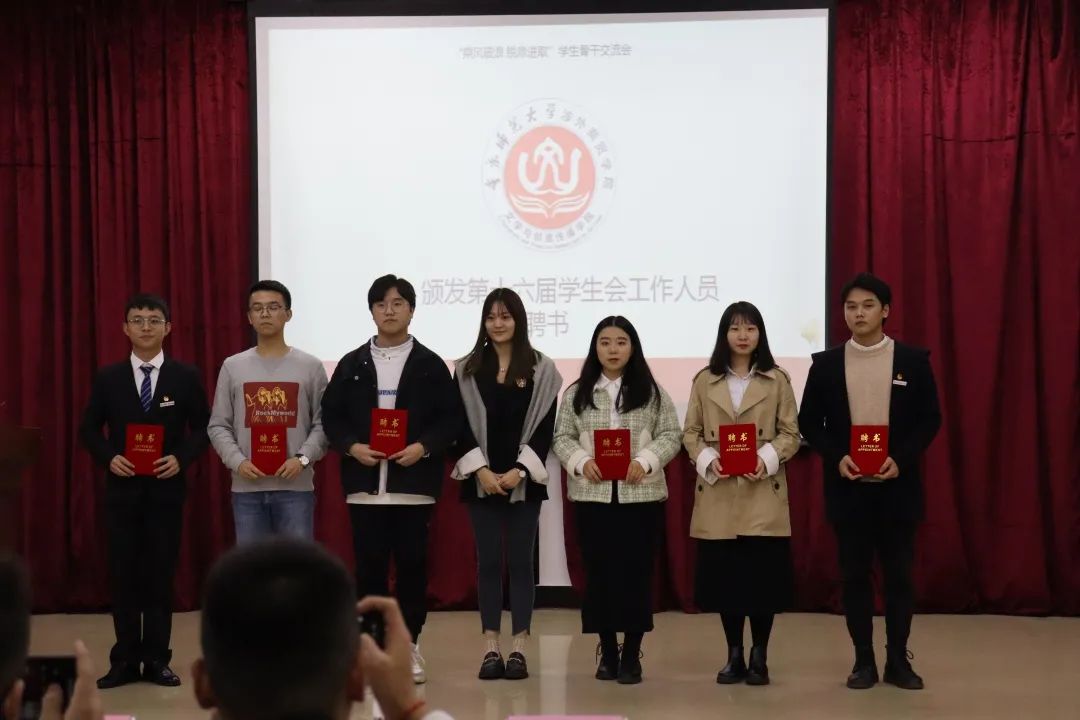 随后,由赖芸屹老师和李香贞老师为第十六届学生组织工作人员颁发聘书,并与工作人员们合影留念;聘书发放完成后,赖芸屹老师上台宣读批复及聘用名单,十七届学生组织成员们端正坐姿,听到自己的名字,骄傲而又自豪。