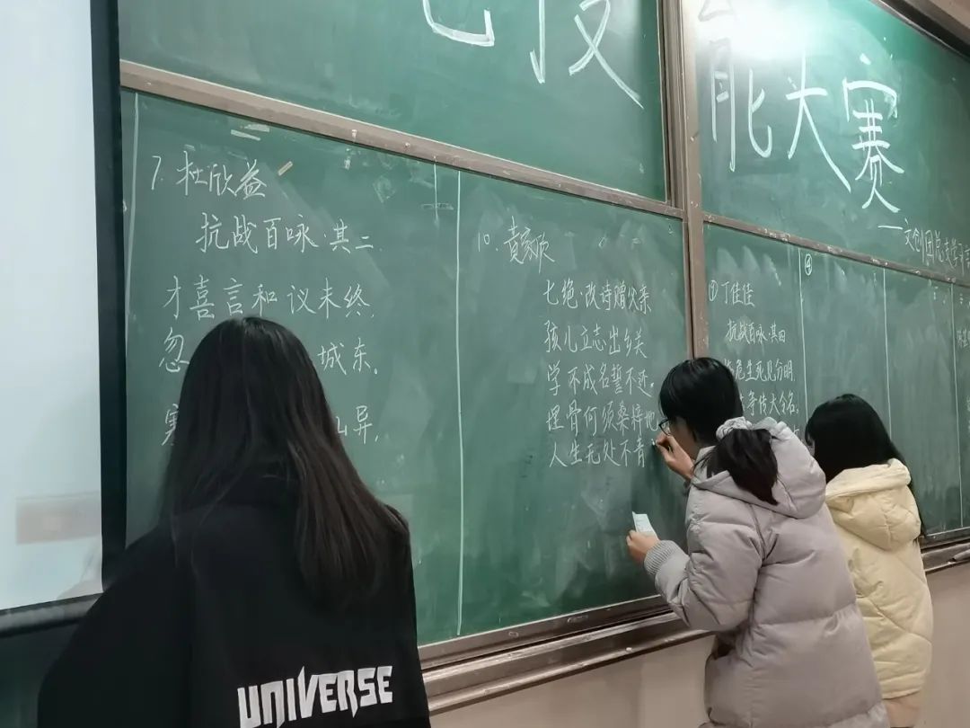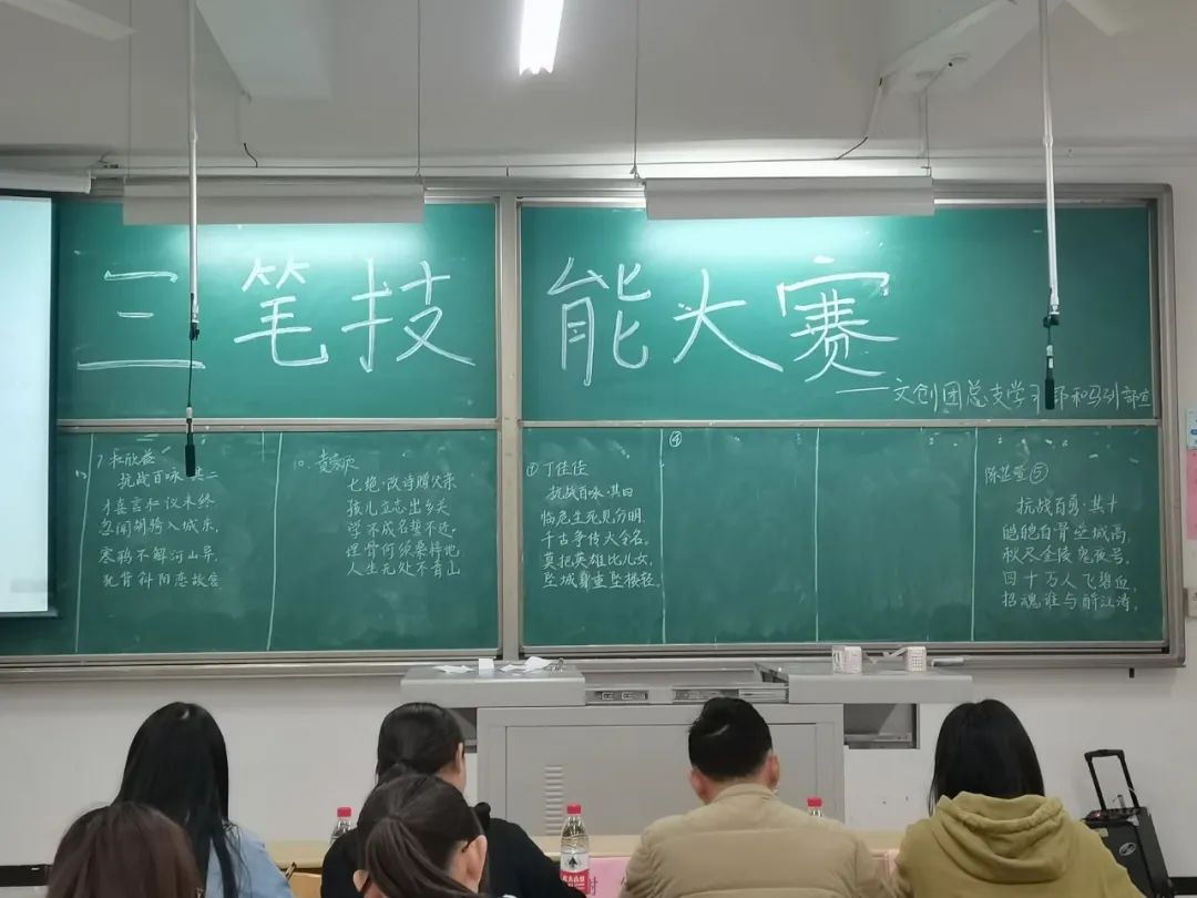 本次比赛分初赛和决赛,比赛的内容为三笔∶毛笔、钢笔、粉笔。活动于12月1日18:30在铜梁校区2502举行初赛。第一项为粉笔字书写,参赛选手们在三分钟的时限内写出了最满意的五言或七言古诗;第二项是在十分钟内完成钢笔书写,参赛选手们在宽裕的时间内写出完成度较高的作品;第三项上交准备好的书法作品,赢得评委赞叹。