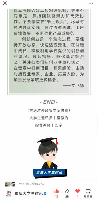 此次获奖作品的诞生,与学院持续推进的实践育人体系紧密相关。学院依托与重庆现代数字经济研究院的产学研合作,将其官方订阅号作为新闻学专业实践平台,程静怡在该平台独立承担创新创业人物专访任务,于2025年6月完成作品创作并发布于“重庆现代数字经济研究院订阅号”。同年7月,该文作为重庆市大学生创新创业优秀案例,被重庆市教委官方平台“重庆大学生微讯”采纳转载,进一步扩大了社会影响力。