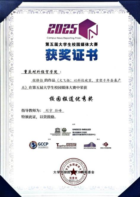 【本网讯】11月1日下午,第五届大学生校园媒体大赛颁奖典礼在深圳大学举行。其中,我院2023 级新闻学专业学生程静怡凭借作品《文飞扬:以科技破茧,重塑千年蚕桑产业》,从全国 91 所高校报送的 795 份参赛作品中脱颖而出,荣获 “校园报道优秀奖”(该赛道不设等级奖)。我校也成为本次大赛中重庆市唯一入围并获奖的高校,这一成绩充分展现了我院在实践教学与产学研协同育人方面的扎实成效。