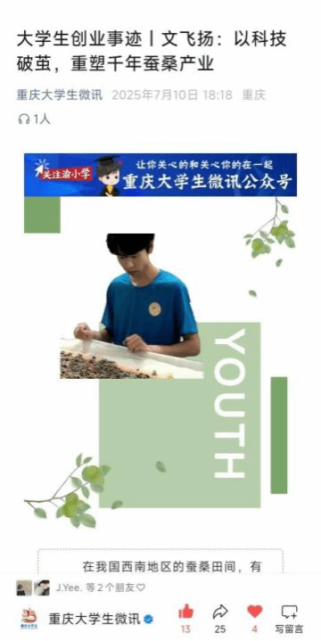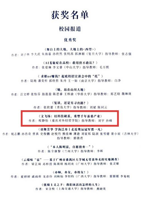 程静怡的作品以科技赋能千年蚕桑产业为切入点,通过深入的案例挖掘与生动的叙事表达,展现了创新创业者的实践精神,既契合新闻学专业 “四力” 培养要求,也体现我院学子关注产业发展的专业视野。在指导教师刘宇、孙峰的悉心指导下,该作品历经多轮严格评审,最终在激烈竞争中成功突围。