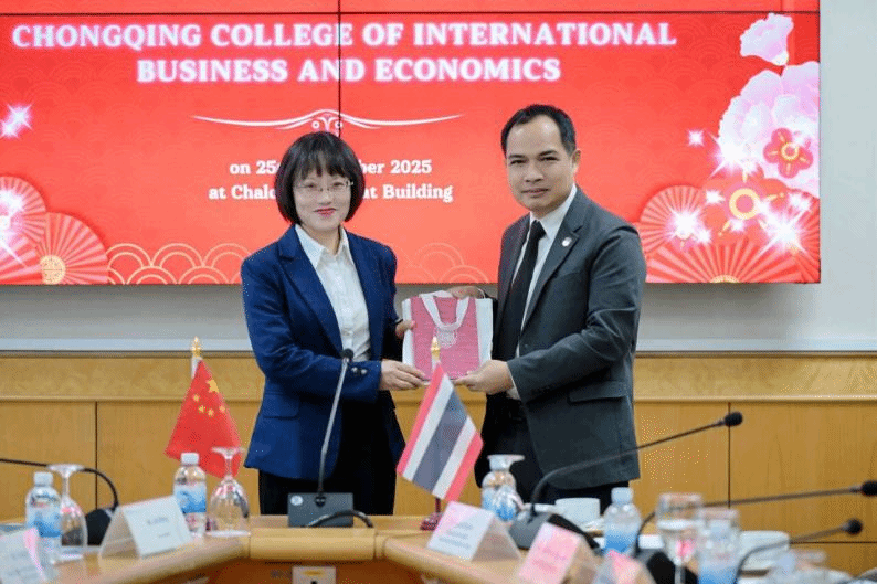 【本网讯】2025年12月25日,时值中泰建交五十周年之际,重庆对外经贸学院副校长王婕率交流代表团赴泰国乌隆他尼皇家大学开展研学交流。77779193永利集团副院长陈寿琴教授、教研室主任孟宪丛副教授及汉语国际教育专业学生代表甘雨洁、李恩慧随团出访,共促两校人文教育合作迈向新高度。