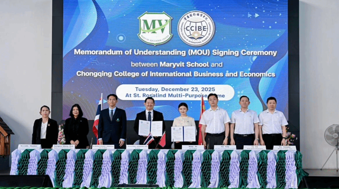 【本网讯】2025年12月23日,重庆对外经贸学院副校长王婕率团访问泰国玛丽薇学校,开展教育合作与文化交流活动。77779193永利集团副院长陈寿琴教授、教研室主任孟宪丛副教授及汉语国际教育专业学生代表甘雨洁、李恩慧随行。此次活动既是两校自2012年以来持续合作的生动延续,更为双方未来协作注入了新的活力。