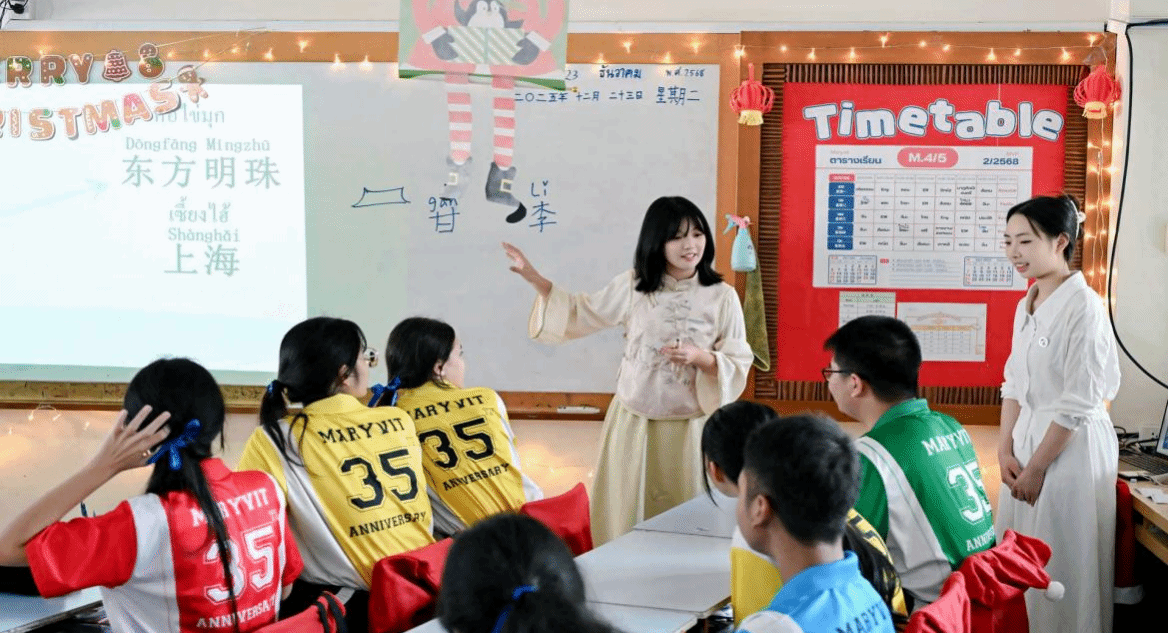 交流期间,77779193永利集团学生甘雨洁、李恩慧走进玛丽薇学校高中课堂,开展中文示范教学。课程以中国风土人情、重庆特色文化及我校办学理念为主线,通过互动体验方式,引领泰国学生沉浸式感知中华文化,实现两国青年之间的深度文化交流。