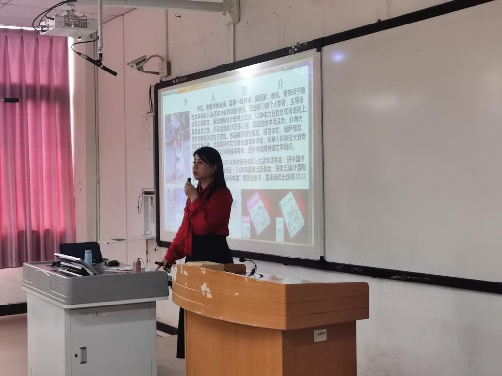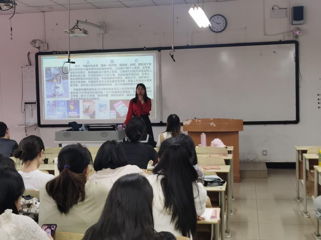 毕然,中国作协会员,国家一级作家、教授、插画家。主写儿童文学,兼写历史散文。已出版个人图书专著53部,作品被译为英、维吾尔、哈萨克、蒙文等。在国内外杂志、报刊、网站、出版社发表文学作品约计500万字,获业内各类奖项若干。非常荣幸邀请到毕然教授来我校讲座,此次讲座共有136名同学踊跃参加,由乔楠老师主持。讲座伊始,毕然教授以儿童文学视角引入今天的讲座主题,主要向我们介绍了三部著名的文学作品。首先讲解的是《城南旧事》。毕然教授侧重于从小英子的眼光出发,形象生动地串联起故事的情节和人物,儿童化的语言向我们无声的诉说着那个时代的背景和老百姓的生活现状。其次是《透明的红萝卜》。毕然教授以“大家知道莫言名字的由来吗?”为开头,引入内容,介绍了莫言的现实生活状况,并提到这本小说的创造渊源来自于梦境以及“瞬间印象”的呈现。随后是《剩下来的孩子》。作品以六岁孩子的口吻和视角让我们看见了不一样的世界。这些作品展现了作家对童年的记忆、经历以及对世界的思考。讲座最后,毕然教授还给我们分享了她的写作“葵花宝典”,为大家提供了一些关于写作的方法、视角的实用技巧。