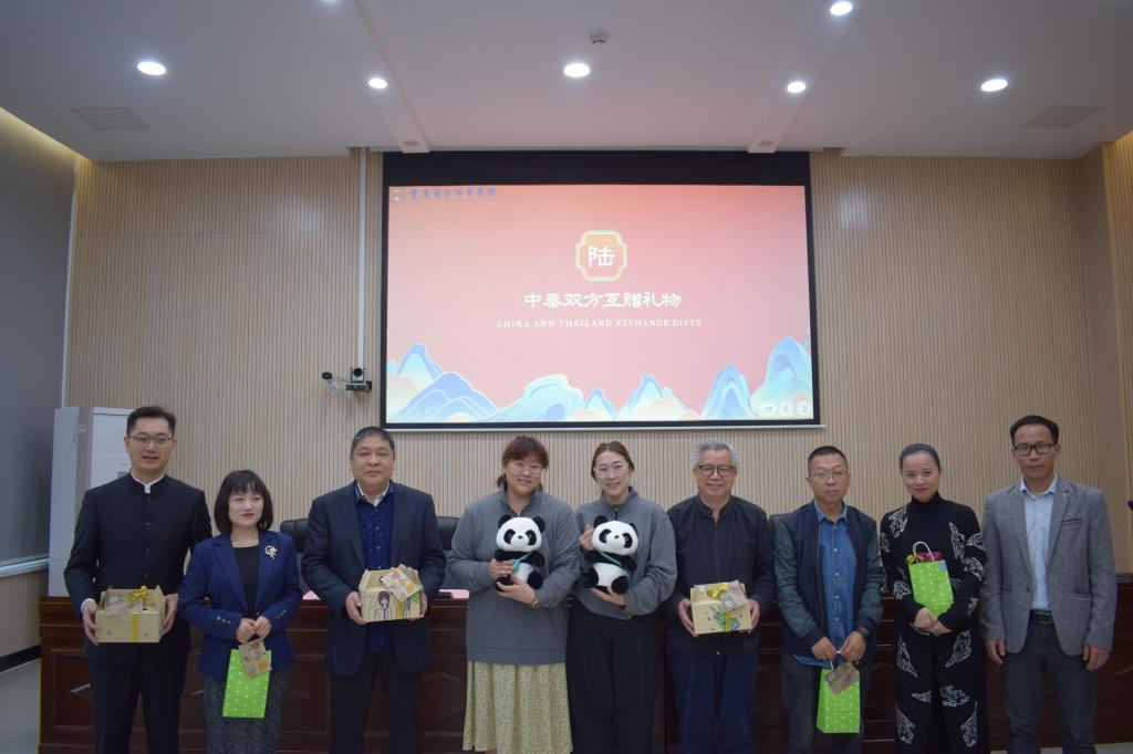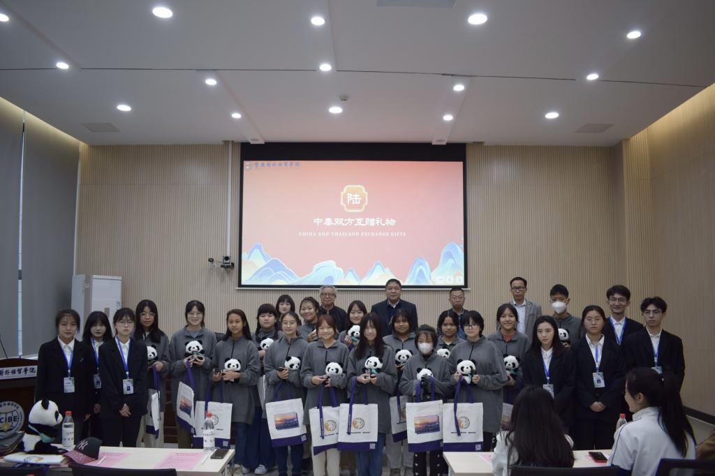 开营仪式最后,中泰双方师生们以互赠礼物的方式展现了“中泰一家亲”的特殊情谊。国宝熊猫玩偶作为礼物分别送给了邱秀文(泰国)老师、邱秀清(泰国)老师和同行的15名泰国学生,成为中泰两国友谊的见证,也通过文化的纽带拉近了中泰双方学子的心灵距离。