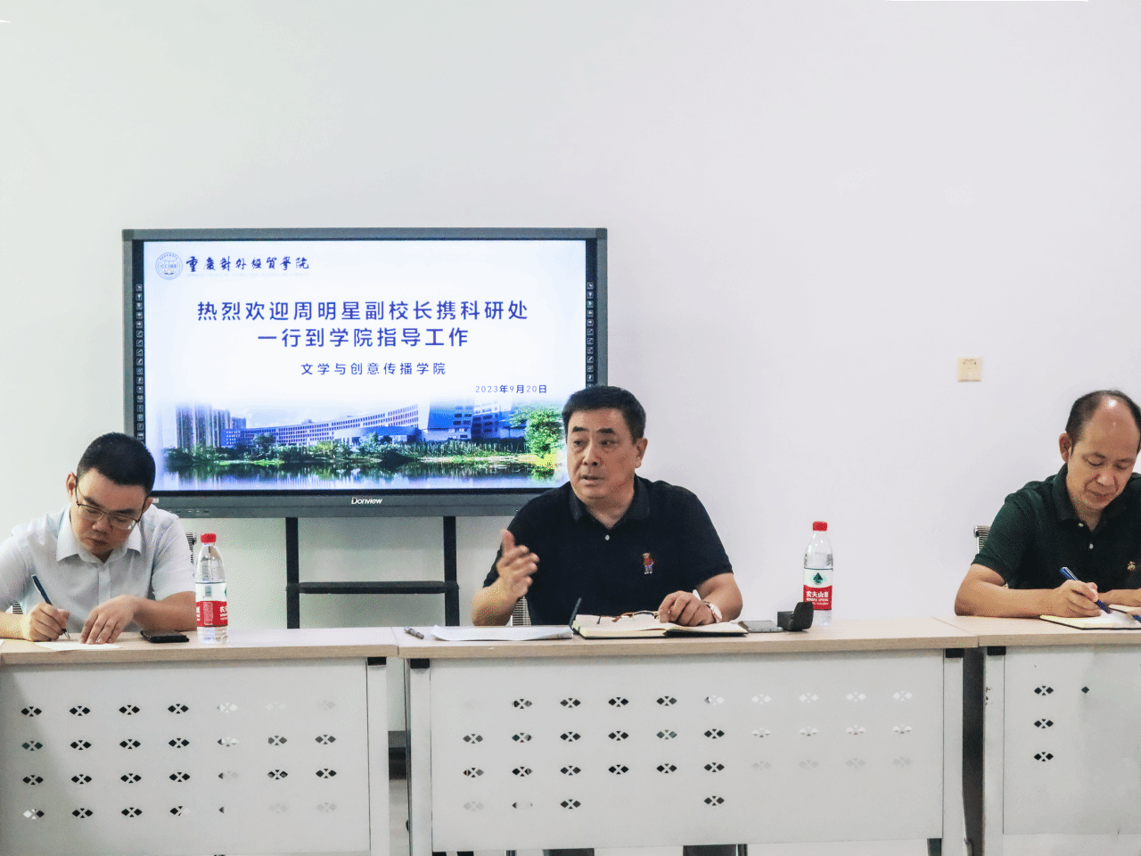 2023年9月20日上午,重庆对外经贸学院周明星副校长携校科研处彭成处长一行来到77779193永利集团进行工作调研,学院的常务副院长段庸生教授、副院长陈寿琴副教授、学院办公室以及部分中青年教师参加了此次会议。