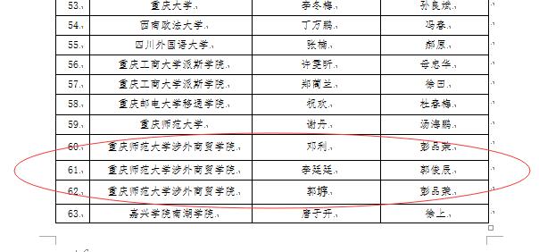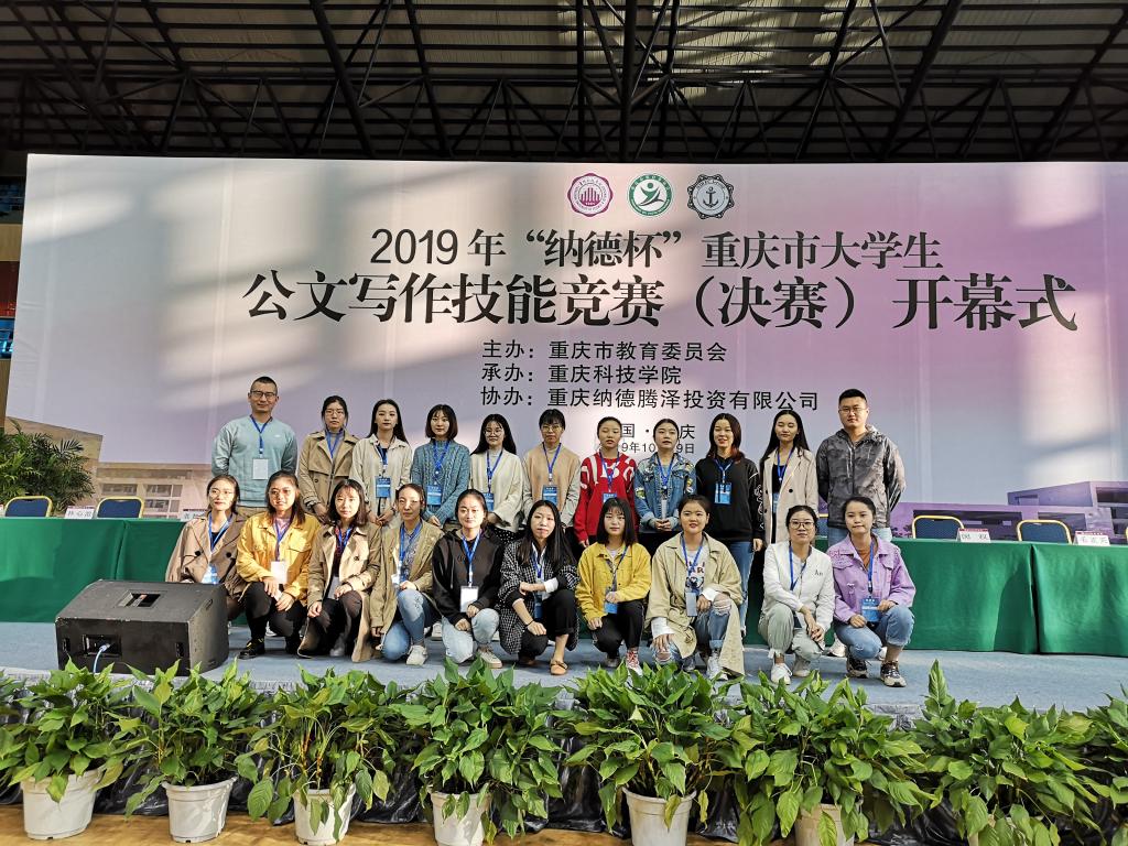 2019年重庆市大学生公文写作技能竞赛(决赛)在重庆科技学院举行,我院学生章流韵、丁莉桦、邓利、李廷廷、郭5名同学获中文类本科组个人赛二等奖,陈林锐、陈卓、邓琳、钟崇艺、谭倩颖、颜小英、曹美容7名同学获中文类本科组个人赛三等奖。