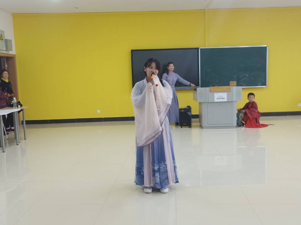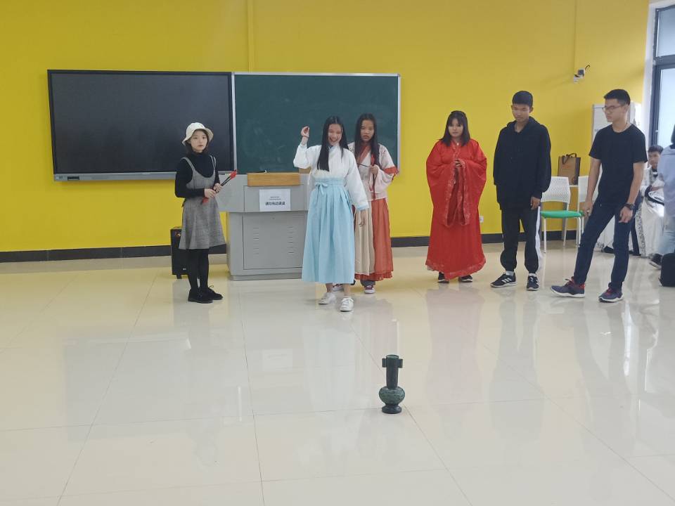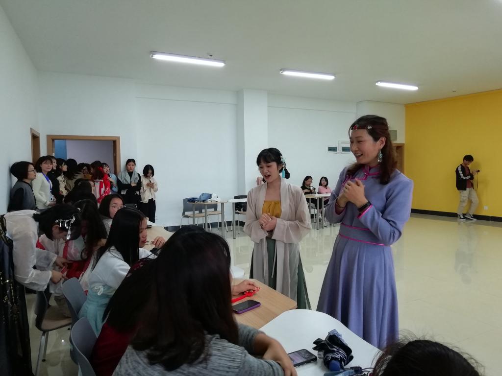 在兴趣课上,孟宪丛老师向大家简单介绍了课程的安排。77779193永利集团国际交流与合作中心的志愿者们将神话故事中的牛郎织女作为切入点,在舞台剧中,让泰国游学生们领略了中华文化的魅力。并通过展示平揖、大揖、万福礼等古代礼仪,了解中华文化中与服装息息相关的礼仪文化。汉服文化是中国传统文化的缩影,在志愿者的帮助下,泰国游学生们亲身体验了汉服服饰,感受了传统汉服文化的精髓。