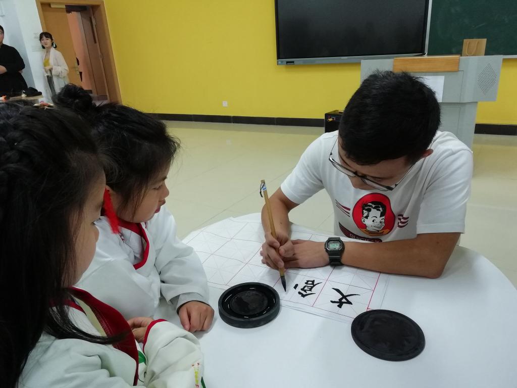 通过教学游戏,旨在增长泰国游学生们学习的兴趣及见识。在古代传统民俗游戏环节中,中泰双方纷纷展示了个人才艺,拉进了彼此之间的距离。紧接着,又进行了古典舞蹈和走秀表演,志愿者与泰国游学生们身着温婉柔美的汉服,行走间裙摆飘逸,风情万千,彰显了汉服所独有的韵味和美感。最后在王志坤同学的毛笔字展示中,结束了今天的兴趣课堂。