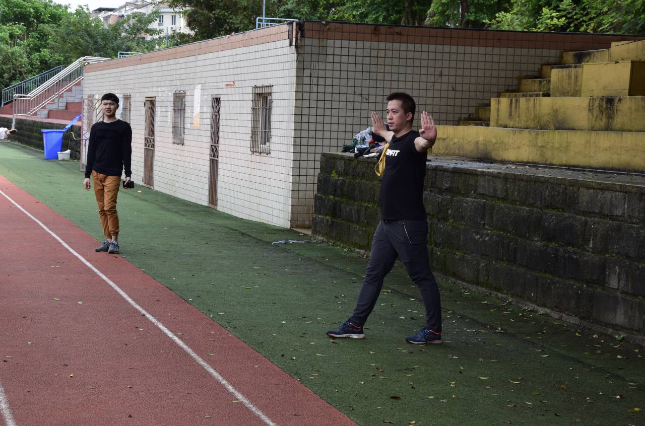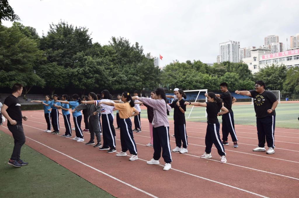 游学生们积极配合老师,认真训练,一遍遍的喊着口号。在每一个出拳与收拳的来回中,感受了中华民族的无穷魅力与磅礴的体育精神;在汗水的挥发之下,体验了重庆师范大学涉外商贸学院的热情好客。