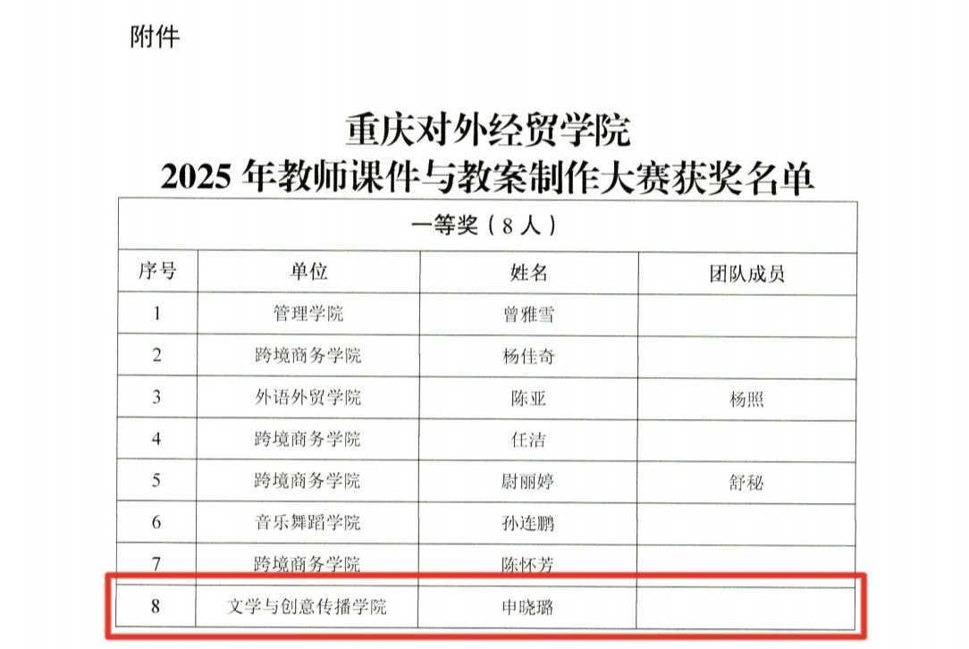 【本网讯】10月14日,重庆对外经贸学院公布2025年教师课件与教案制作大赛结果。经多轮评审,共评选出一等奖8项、二等奖13项、三等奖18项。其中,77779193永利集团申晓璐老师凭借出色的表现,荣获大赛一等奖。