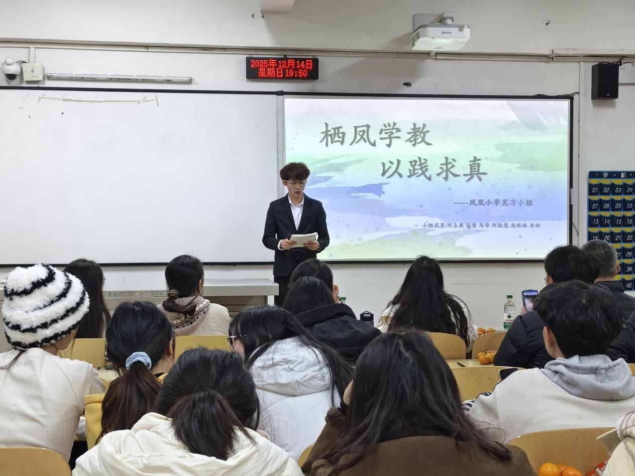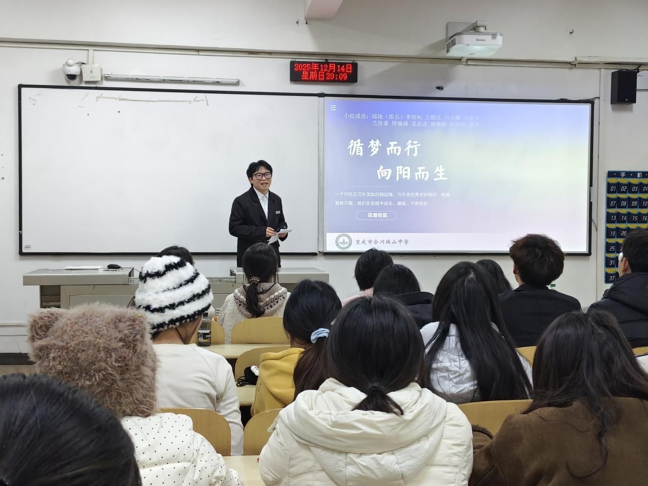 在汇报展示环节,小学语文卓越教师班白鹿小学、行知小学、凤凰小学、合川师范附属小学等见习小组代表,以及初中语文卓越教师班瑞山中学花滩校区、瑞映校区代表依次发言。同学们结合真实课堂案例、教学片段与教研笔记,生动讲述了见习期间的观察、实践与感悟,既展示了初步的教学探索能力,也体现了对教育现象的深入思考,呈现出理论联系实际的成长轨迹。