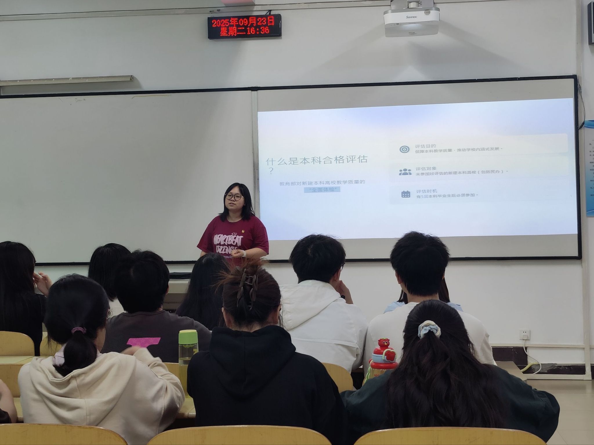 本次团组织生活以本科合格评估知识普及为核心,流程清晰且互动性强。活动开篇,支部成员齐唱《光荣啊,中国共青团》,激昂旋律唤醒责任意识;随后,团支部书记秦传虹详细介绍活动背景、流程与核心目标,着重强调本科合格评估对学校发展及学生个人的重要意义,引导支部成员重视评估工作。