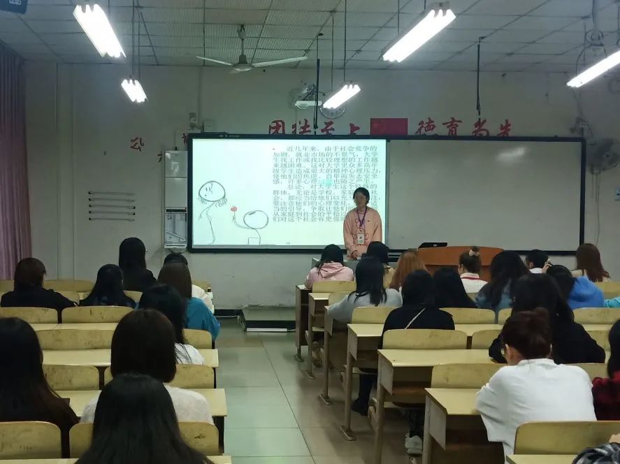 活动开始,权益保障部工作人员做开场白,并宣读相关文件指示精神;活动中通过相关心理教育视频,以及近期发生的一些未通过正确疏导而造成学生严重心理问题的实例,来向大家说明心理健康的重要性。