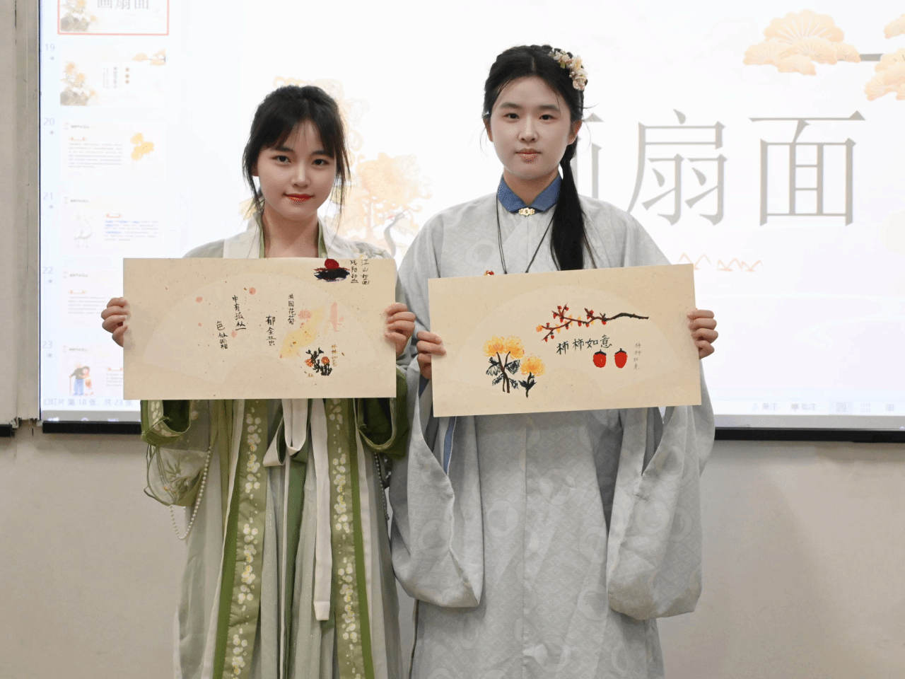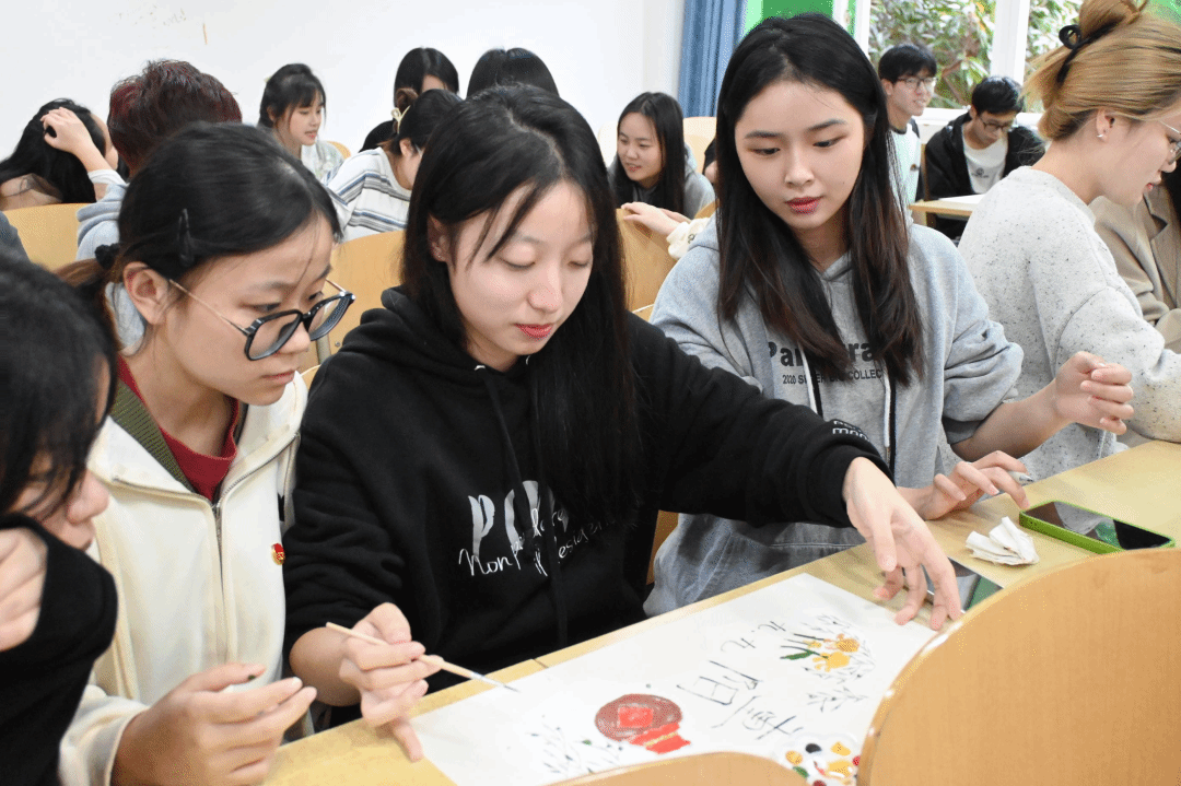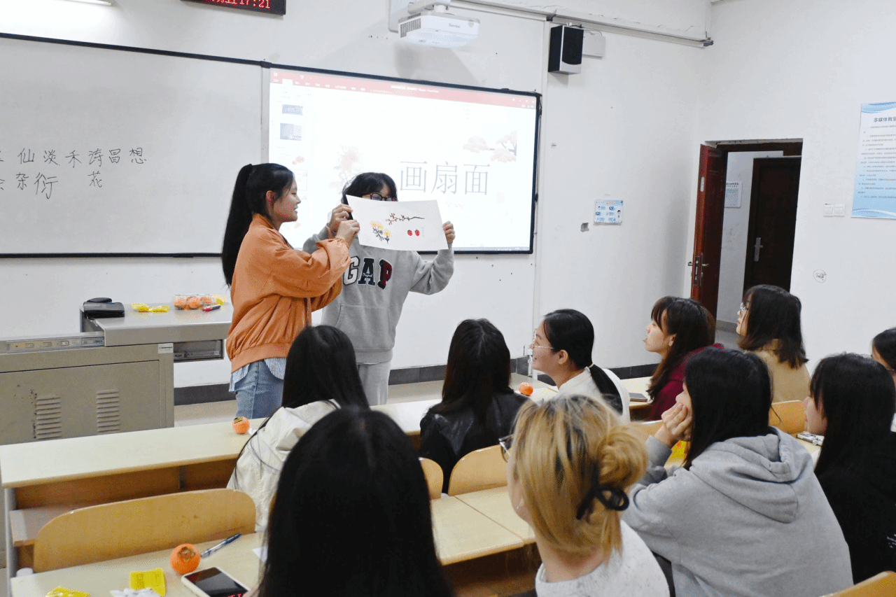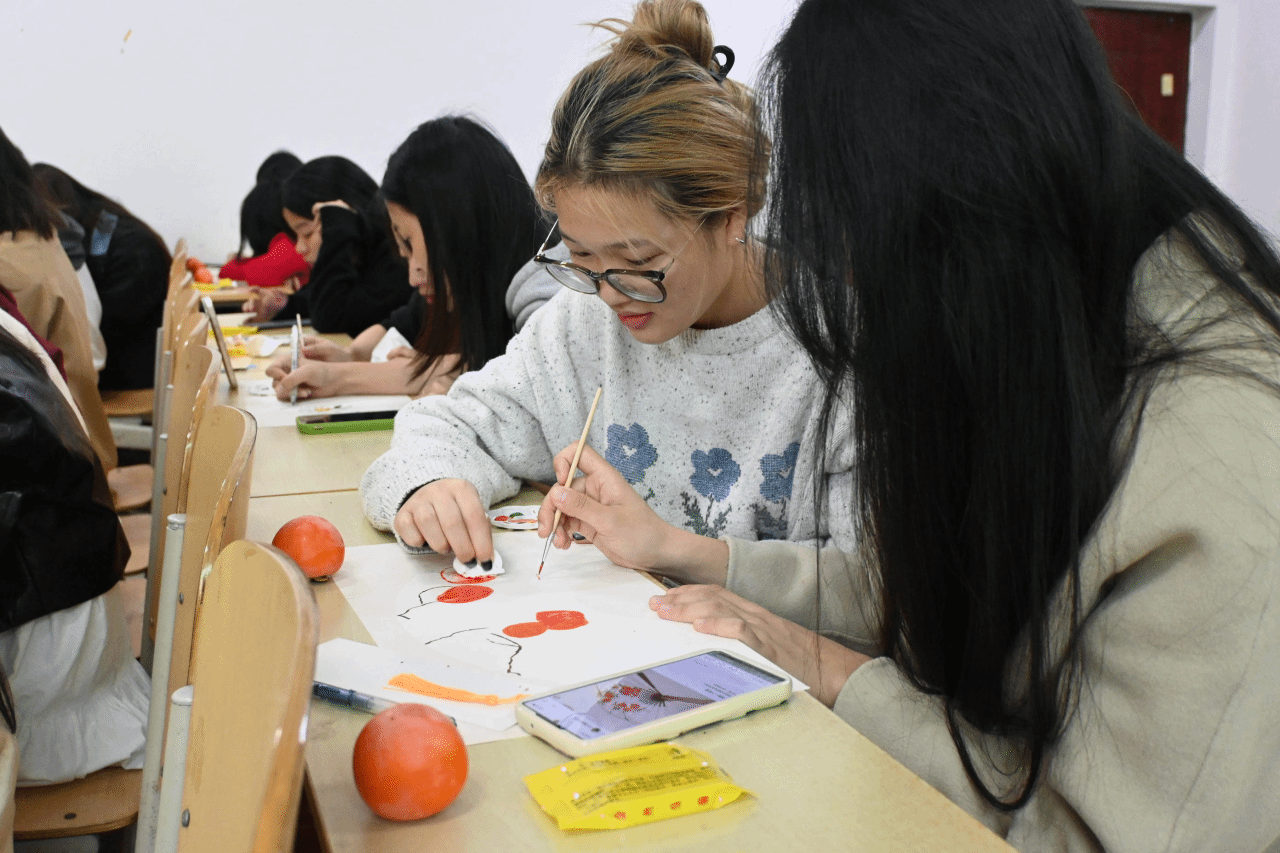 接下来,团支部书记徐杨和组织委员蒋晨韵组织支部成员们进行了“画扇面”的活动,成员们友好协作,在小小画纸上以“霜降习俗”为主题尽情创作。一笔一画,浓淡轻重,勾勒出一幅幅神韵独特的扇面。支部成员们飞舞画笔,线条自然或繁复,色彩绚丽或清新,绘出别具一格的扇面,切身领略中国书画艺术的风韵。