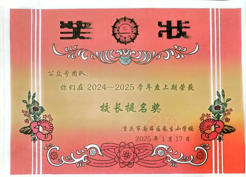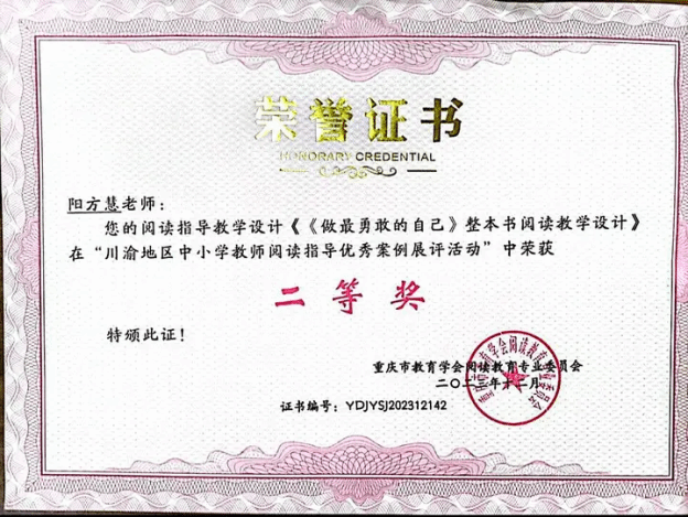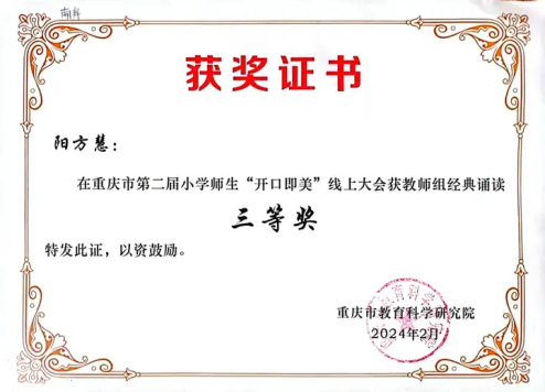 2023年11月,区级“新城杯”第九届中小学师生书法作品邀请赛活动中,获教师组毛笔书法三等奖;2023年12月,市级“川渝地区中小学教师阅读指导优秀案例展评”活动,其教学设计(《做最勇敢的自己》整本书阅读教学设计)获二等奖;2024年1月,区级第39届青少年科技创新大赛,其教师科技论文项目(《论素养导向下信息技术在小学低段语文课堂教学中的运用》)获一等奖;2024年2月,市级第二届小学师生“开口即美”线上大会,获教师组经典诵读三等奖;2024年5月,区级中小学优秀阅读指导课案例(《你看起来好像很好吃》绘本阅读指导课)评选活动一等奖;2025年1月,“公众号”团队在2024-2025学年度上期荣获“校长提名奖”;2025年1月,“开口即美”实践研究成果(《小熊过桥》)获市级一等奖。