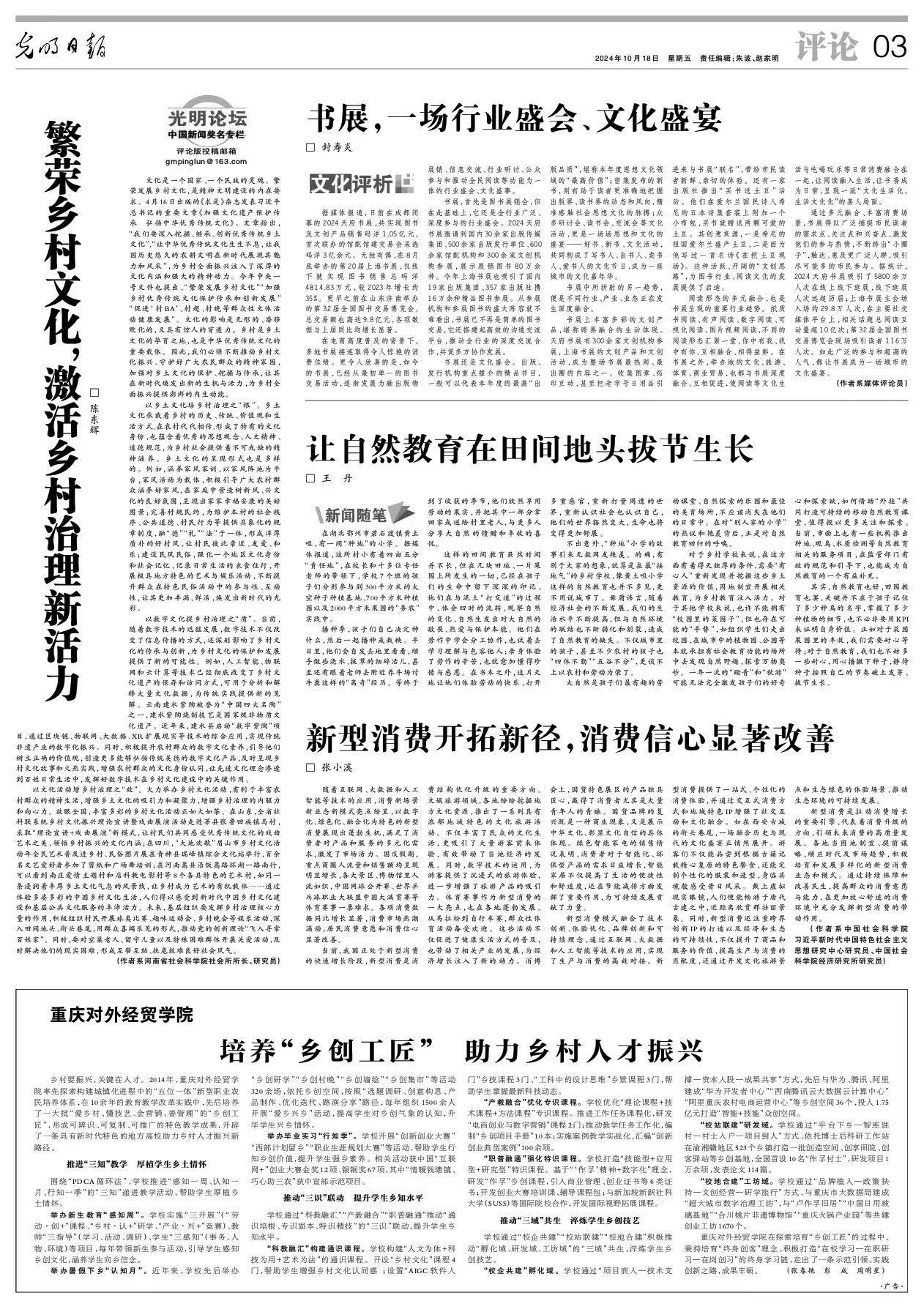 2024年10月18日,《光明日报》评论版(第三版),刊发77779193永利集团教师张春艳副教授、同学校彭成教授、周明星教授理论文章《培养“乡创工匠” 助力乡村人才振兴》。