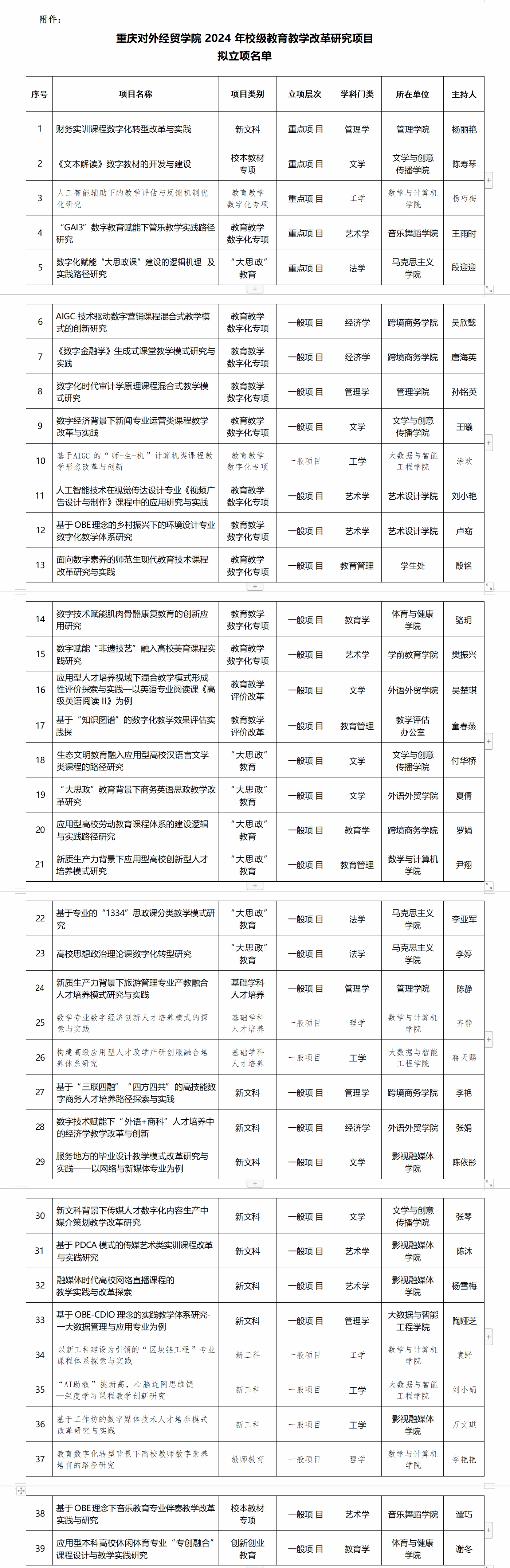 附件:重庆对外经贸学院2024年校级教育教学改革研究项目拟立项名单