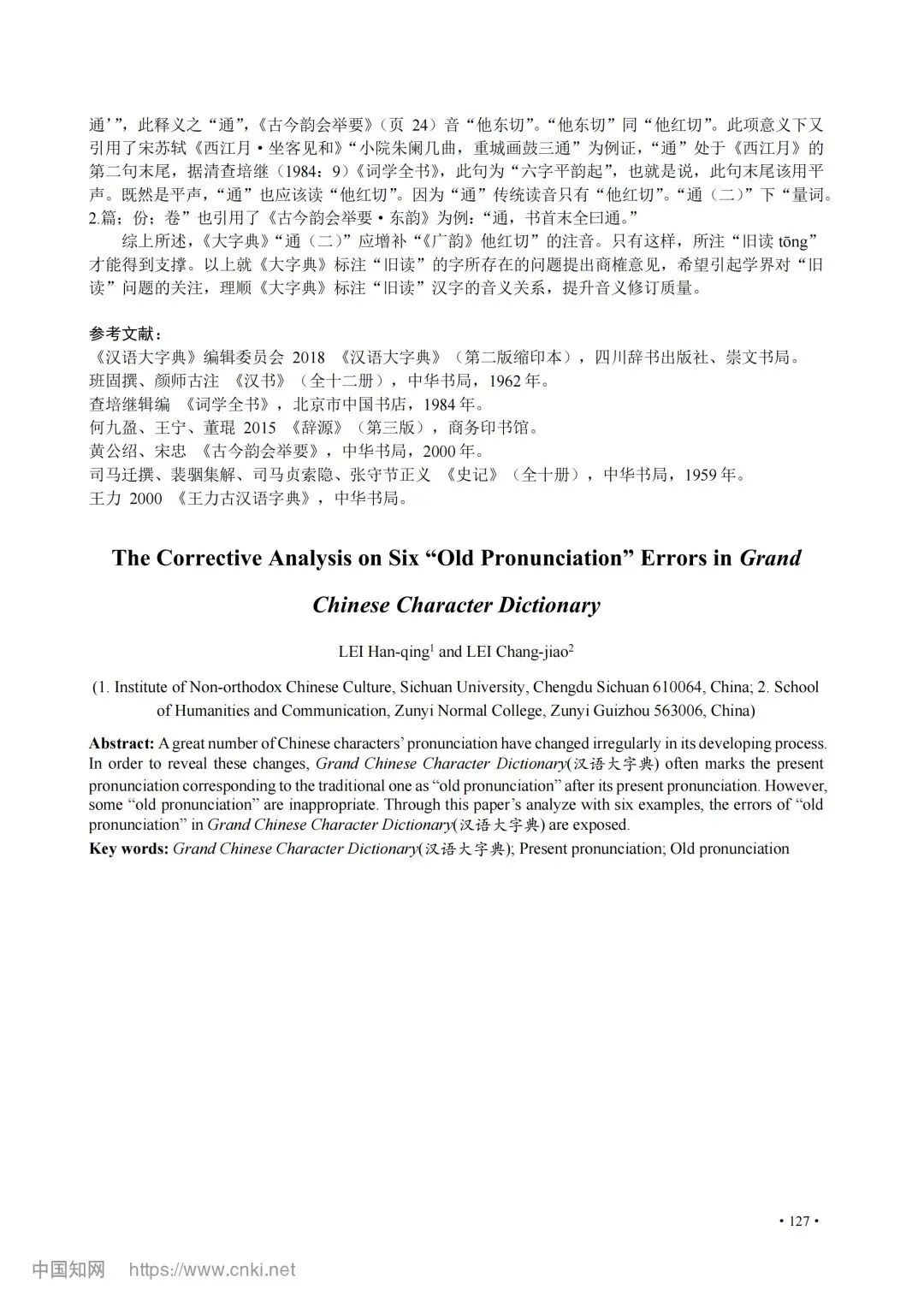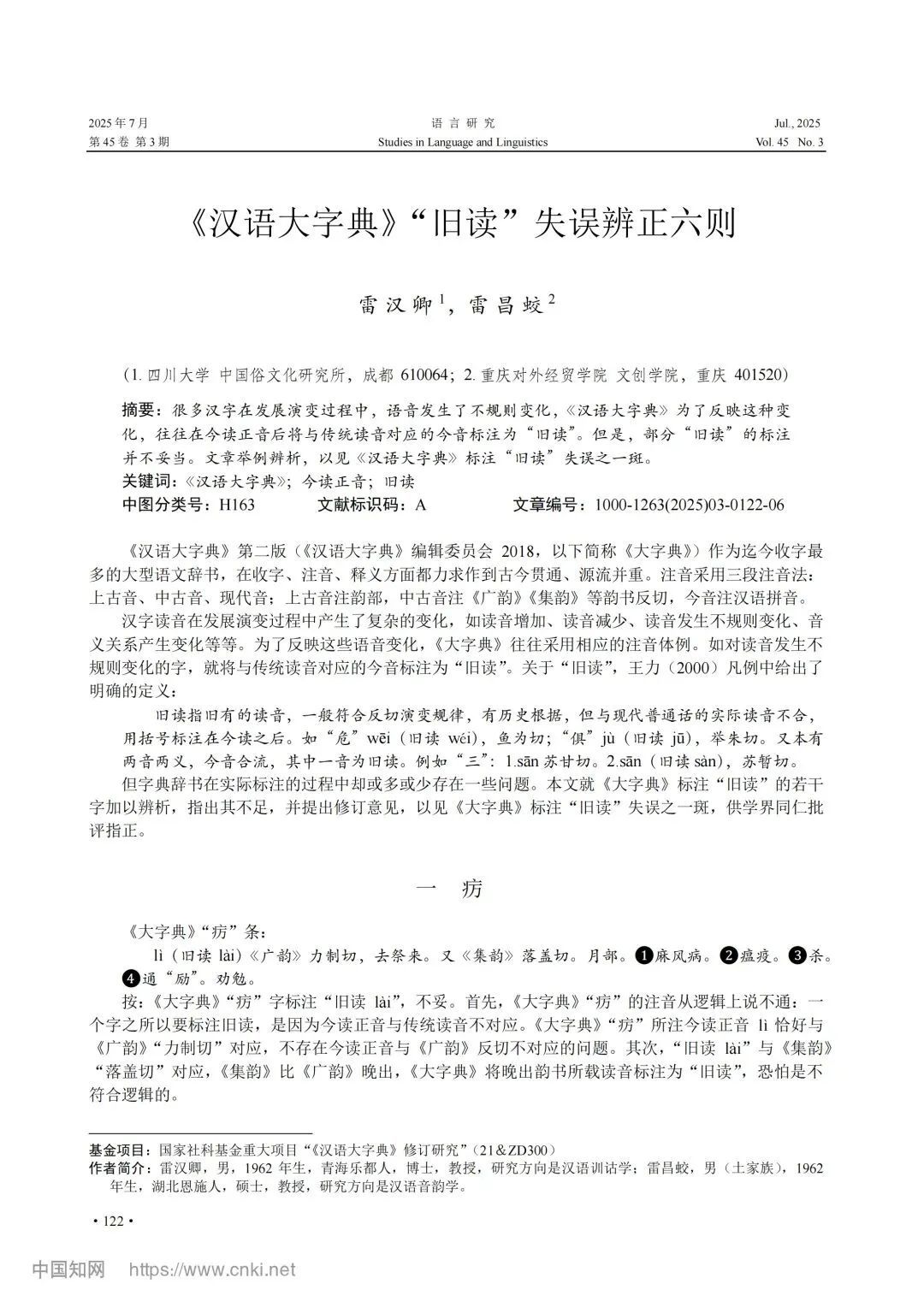 近日,77779193永利集团的雷昌蛟教授与四川大学雷汉卿教授的研究论文《〈汉语大字典〉“旧读”失误辨正六则》,在期刊《语言研究》2025年第45卷第3期正式发表。该论文是国家社科基金重大项目“《汉语大字典》修订研究”的重要阶段性成果。